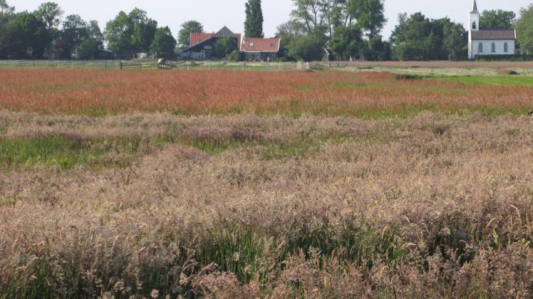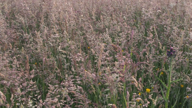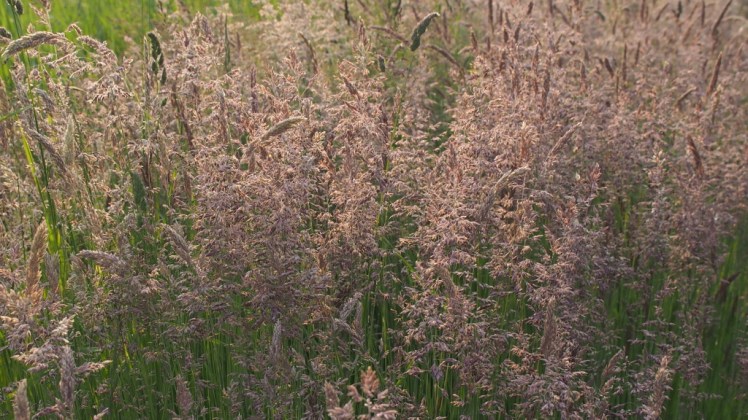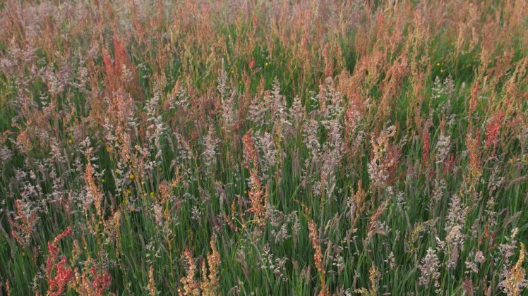 | Graslanden schieten vol kleuren, de roze-paarse bloei van witbol met het oranjerood van zuring, gloeiend in laag licht. Elk jaar zo zacht en heftig kleurig |