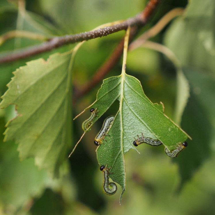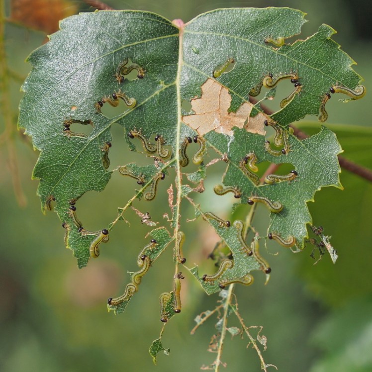 zij aan zij: eten eten eten eten eten groeien vervellen groeien vervellen groeien tot je groot genoeg bent om te overwinteren en verpoppen tot een bladwespje (nee, deze ‘bastaard’rupsen worden geen vlinders) |