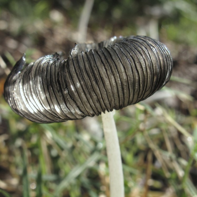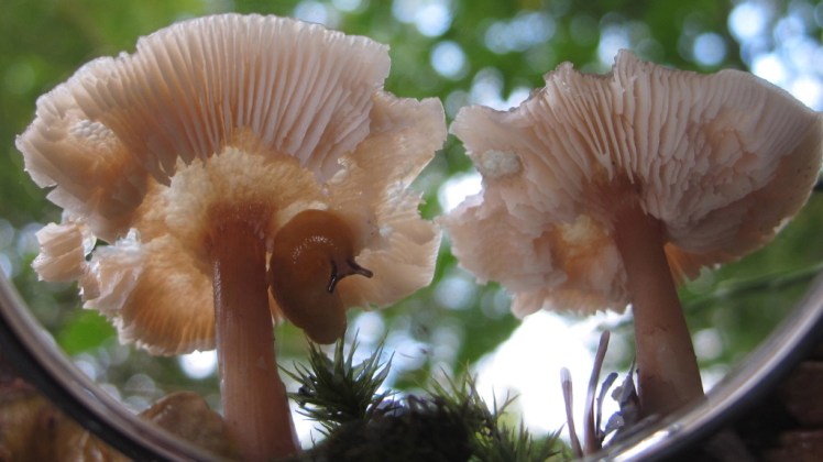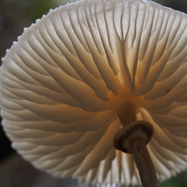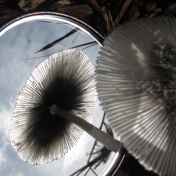 | Paddestoelen onder de hoed gekeken met een spiegeltjeom het ‘hart’ te zien waar het om draait in een paddestoelenleven: de plaatjes waar (porceleinzwam) |