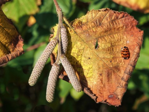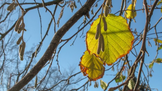 | De knoppen zijn gevuld met piepjonge blaadjes de katjes hangen klaar nog stevig geslotenook de laatste bladeren kunnen afhechten en loslaten: hun taak zit erop.Boven: iep onder: hazelaar |