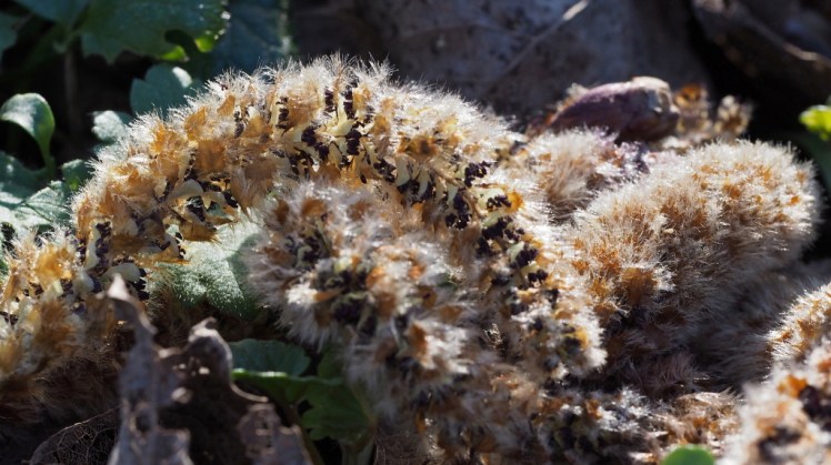 | Nog dichte meeldraden rood, de bloeiende propvol geel stuifmeel. Uitgehangen, uitgewaaid, uitgestoven en afgewaaid, de gevallen mannetjes: hun werk gedaan.Donzig harig van de vliesdunne kelkblaadjes die tussen de ‘bloempjes’ zitten. |