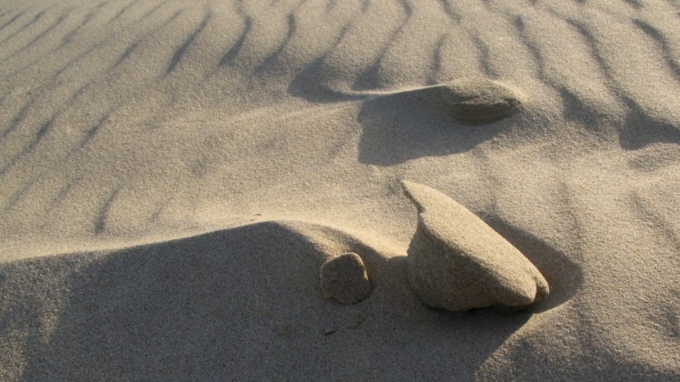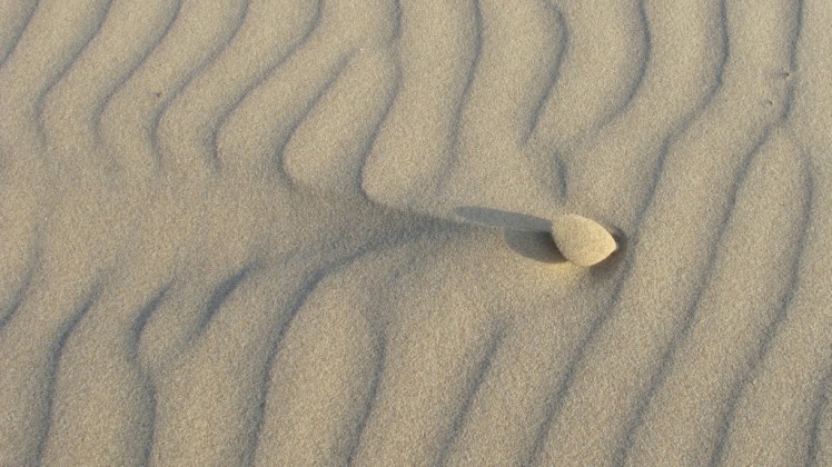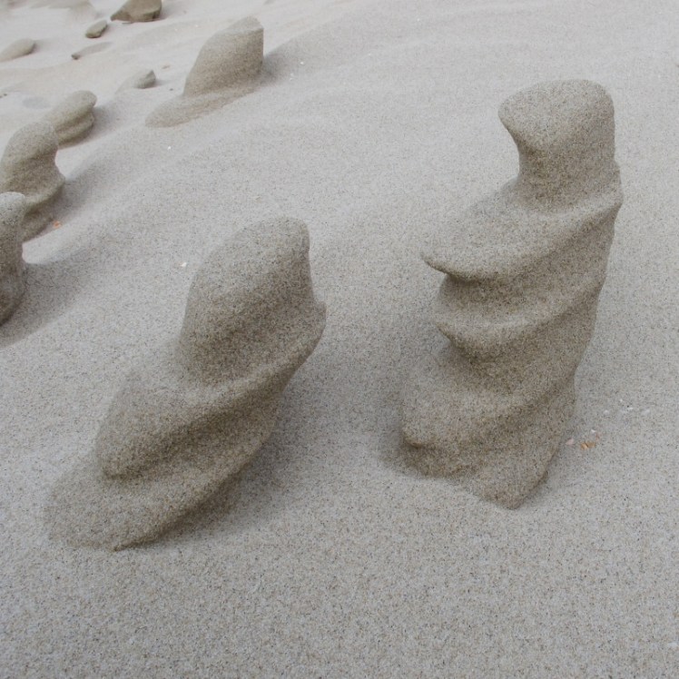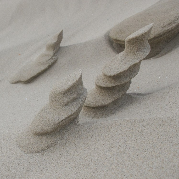 | Nat zand plakt, droog zand verwaait en ondergraaft het ‘vaste’ zandeen eindeloze schepping van zandbeelden |