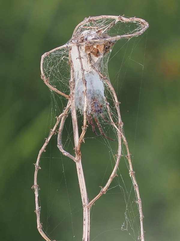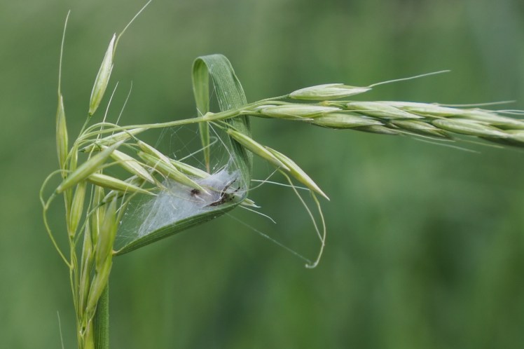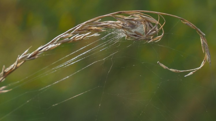 | Een hoge grashalm met spinsel rondgetrokken, de jachthut van een spin |