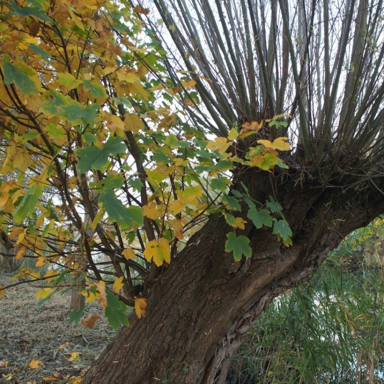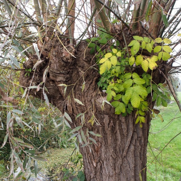 | De gasten zijn gekiemd en gegroeid in hun dode binnenste: esdoorn, es, berk, braam, een varen, terwijl de wilg heel levend doorgroeit.De inwoners staan wel te kijk als ze later ‘winterklaar’ zijn dan hun gastheer, hun groene beschutting al verdwenen. |