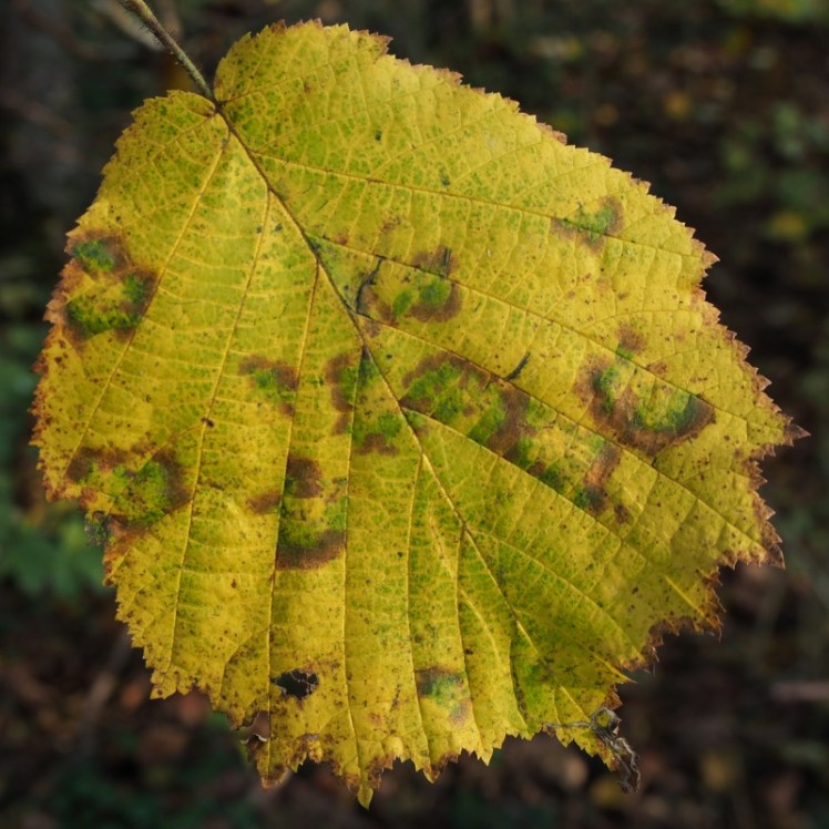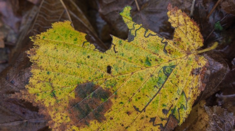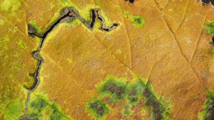 Voor soortenliefhebbers: de gangen zijn gegeten door de larven van een mineermotje (Stigmella microtheriella).