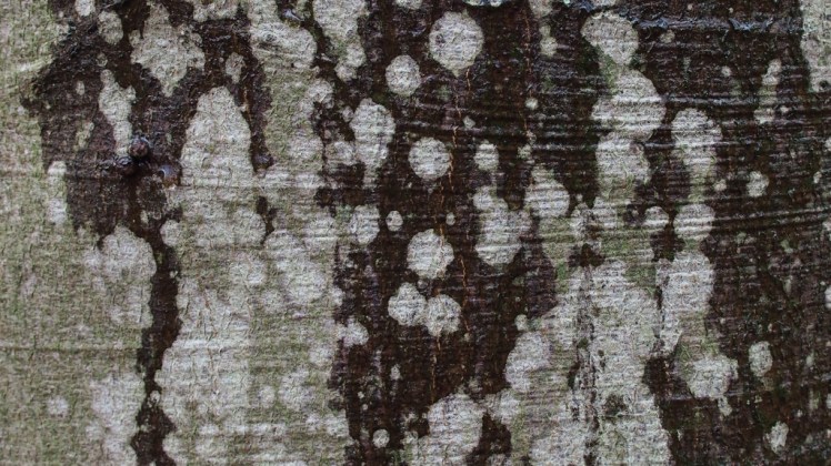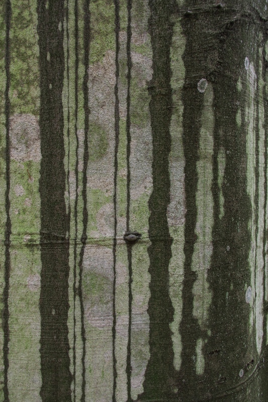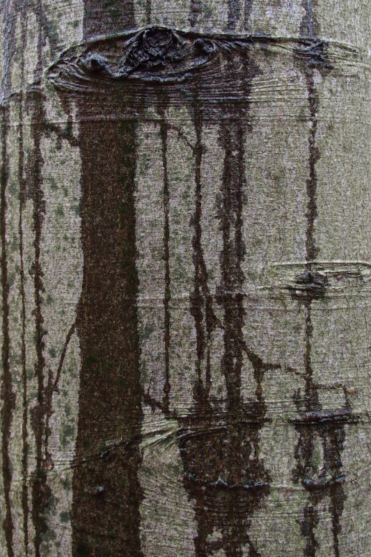 | Druipend water trekt donkere lijnen in een mooi onregelmatig ritme gestuurd door de structuur van de bast |