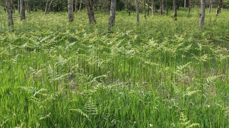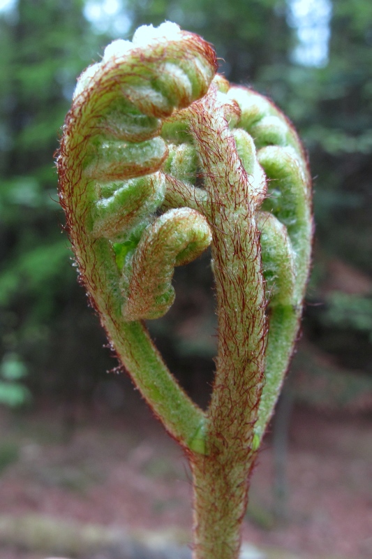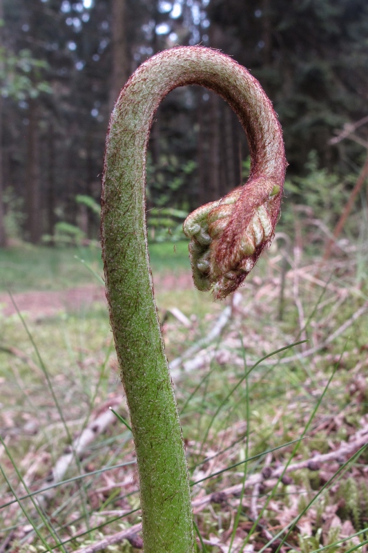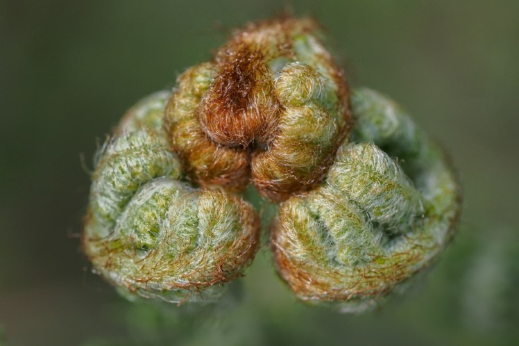 | De lange stelen van adelaarsvarens rollen op uit de winterbodem en ontrollen hun bladeren nerf voor nerf, blad voor blad, zijblaadje voor zijblaadje uit hun ingerolde bescherming |