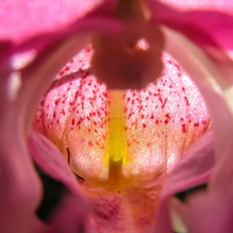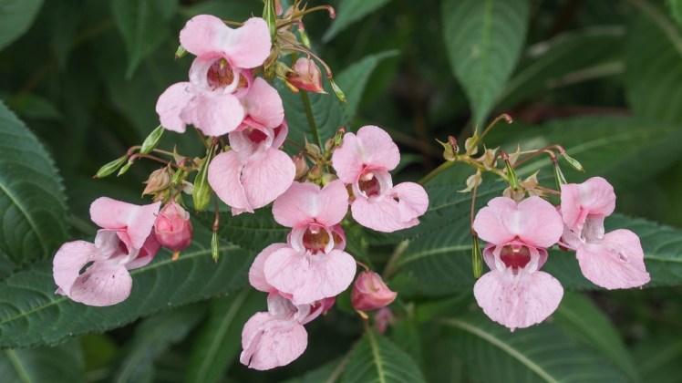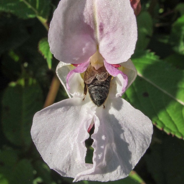 | De reuzenbalsemien heeft zijn schatkamers geopend met een lonkend in-zicht naar nectar diep weg in het oplichtende buisje. Hommels en bijen passen precies langs stuifmeel (aan het klompje bovenin) en stamper. Een bij ondersteboven? Een buikschuiver/buikbestuiver? |
