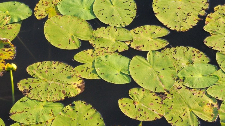 De kronkelige vraatsporen zijn van waterleliehaantjes (de larven en de kevertjes)