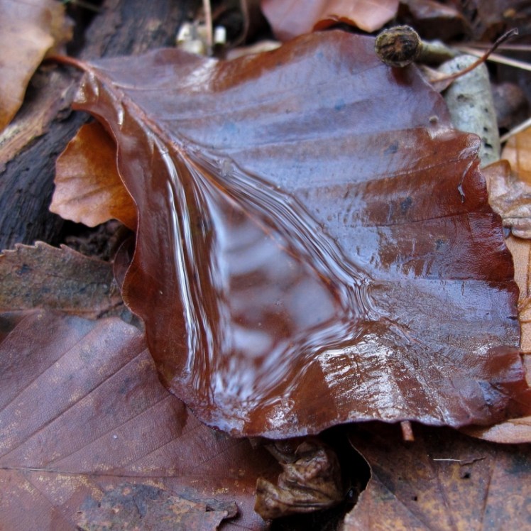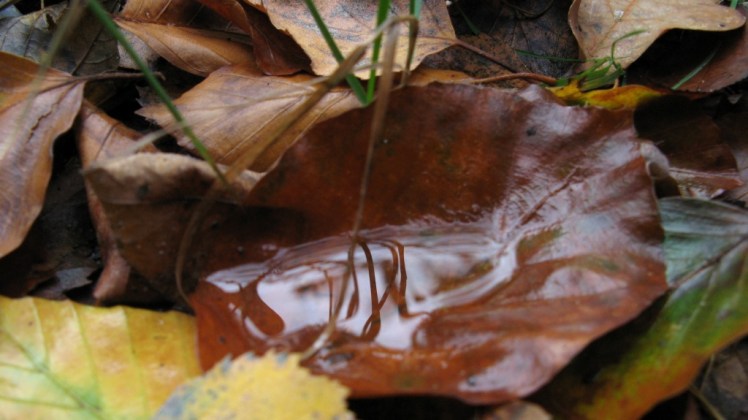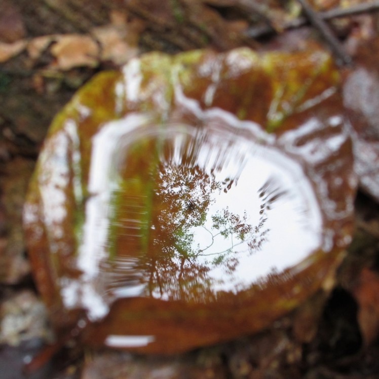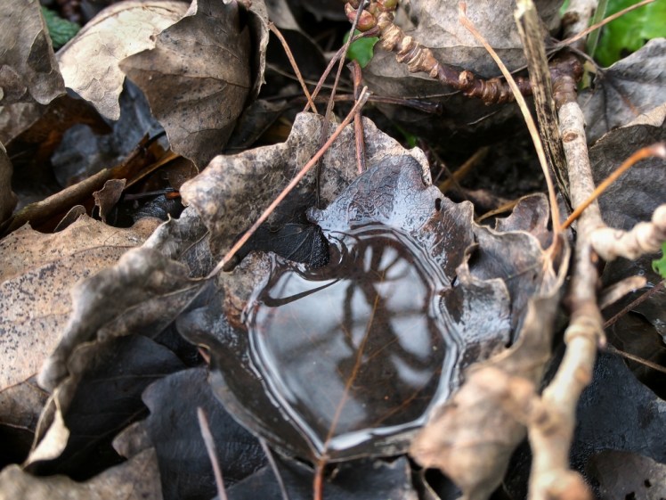 | Zo’n regendag vult de bladkommetjes tot vijvertjes die hun wereld spiegelen |
