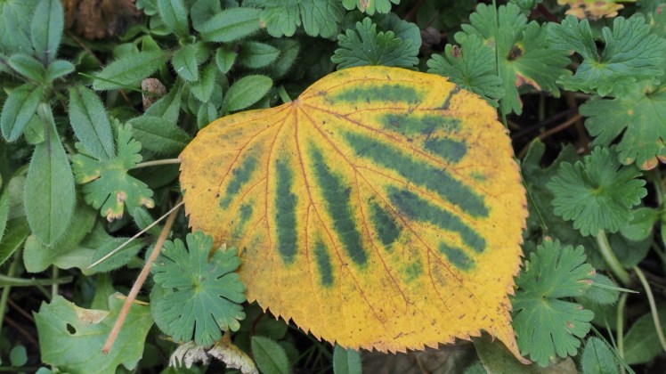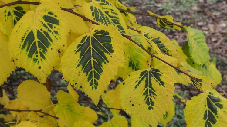 Bladeren van linde op droog zandig talud, deze zomer half vergeeld.