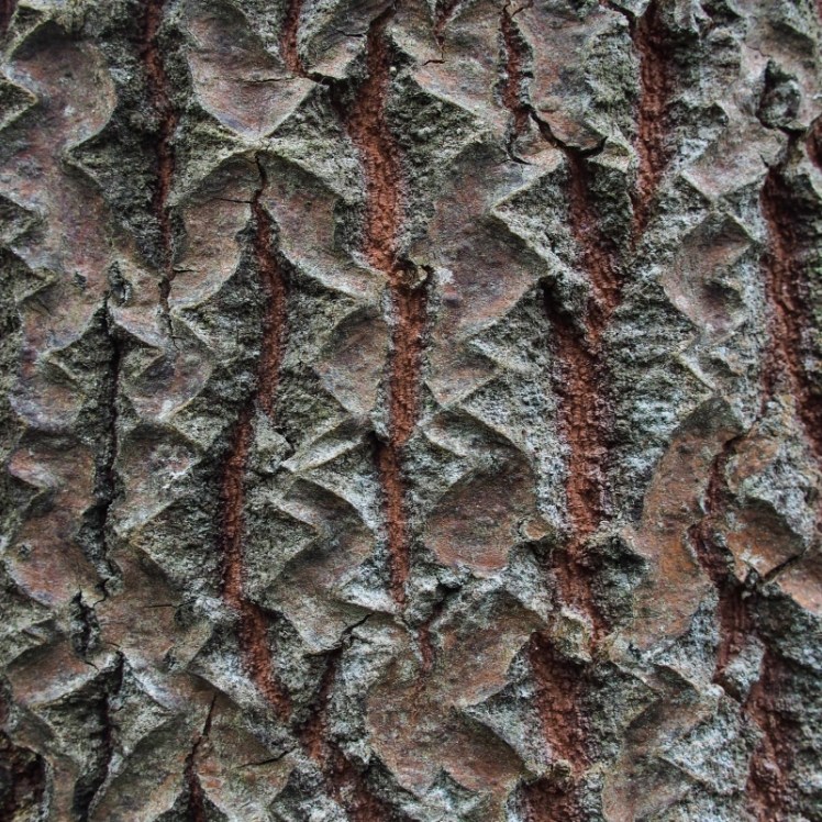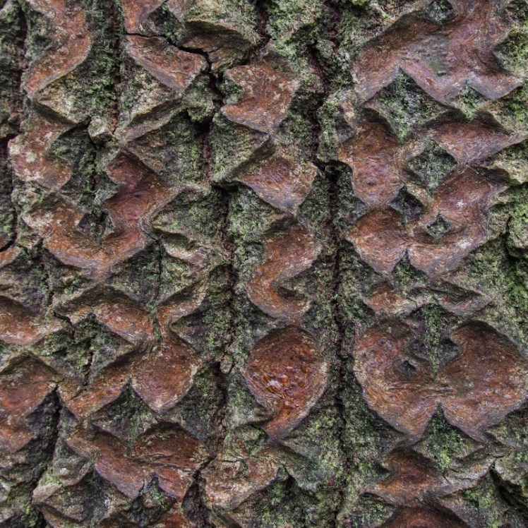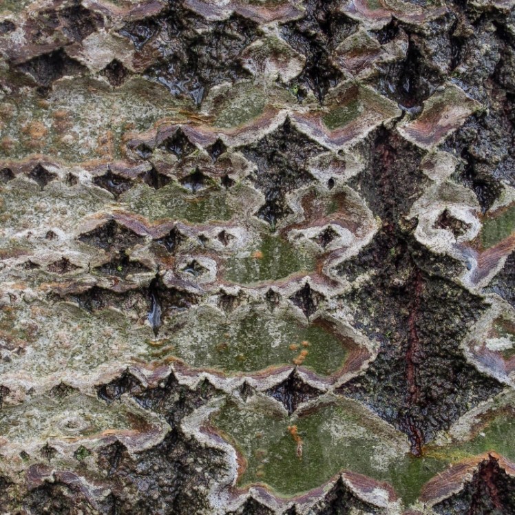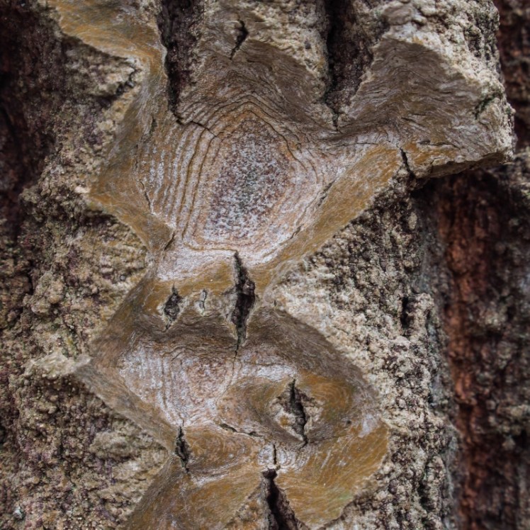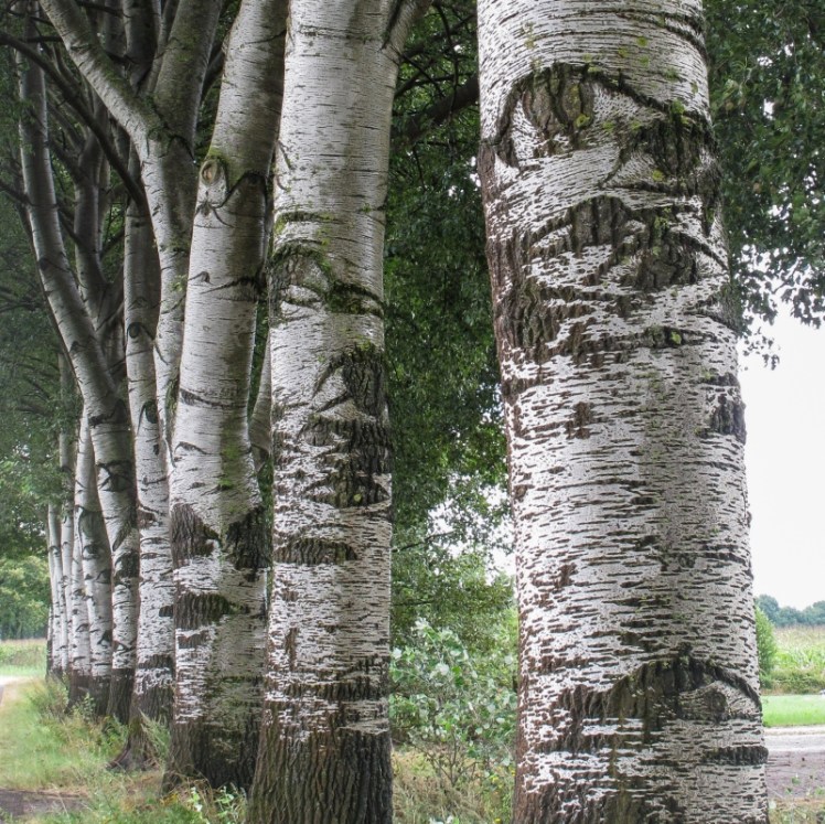 Een boom kan alleen groeien als hij barst: de bast van witte abelen barst in ‘dropjes’/ruitvormige spleetjes die hij ook gebruikt als ademgaatjes.De restjes witte schors kleuren door algen, korstmossen ea.