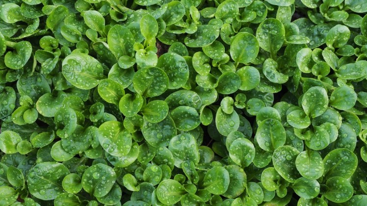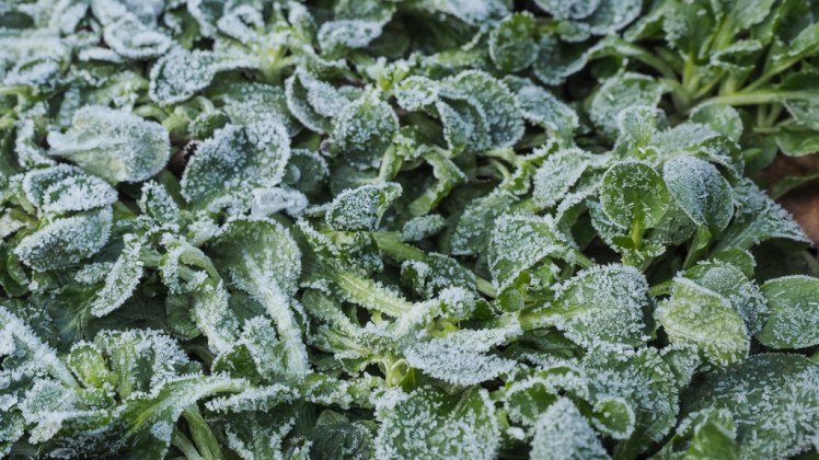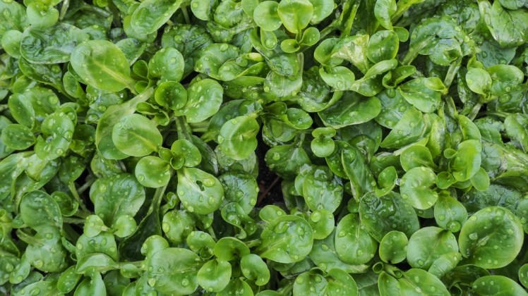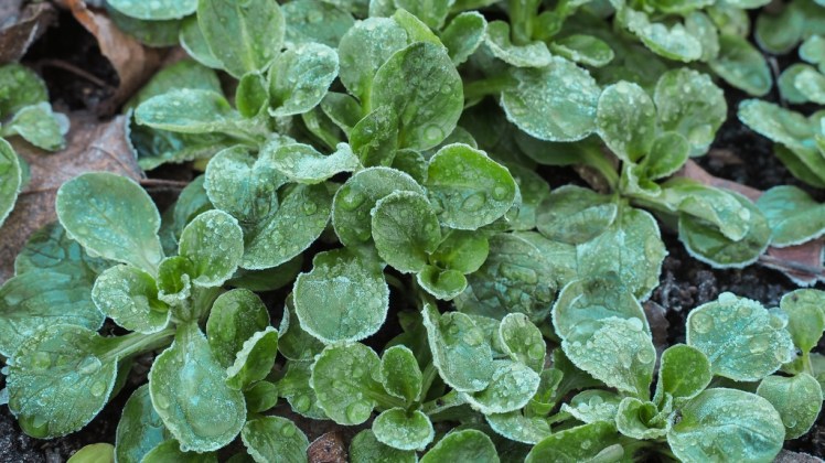 | Zo jong nog …., zo laat gezaaid, als verse wintergroente, overleeft het deze vorst en rijp met het dekentje van fijne sneeuw en hagelkorreltjes? Een enkel stukgevroren blad, maar de meesten gezond, met waterafgestoten druppels. |