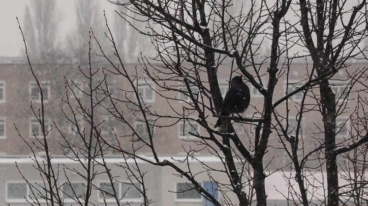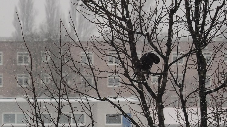 | In kale winterbomen is het slecht schuilen voor regen en sneeuw, dus even goed poetsen = veren vetten, voor een waterwerend zwart pak. |