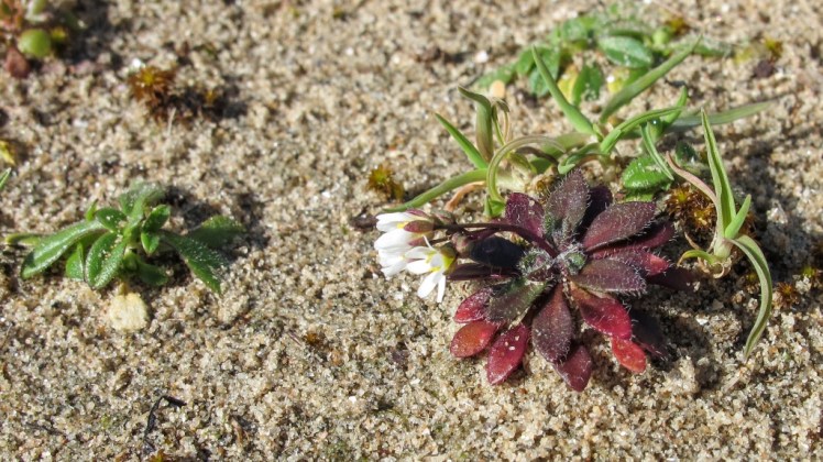 | Hier kun je beter vroeg bloeien, en je zaden snel klaar: vóór het brandend zand onder de zomerzon. Laag-bij-de-grond voor wat luwte tegen striemend zand en bij overstuiven: de kop weer boven het zand groeien … |