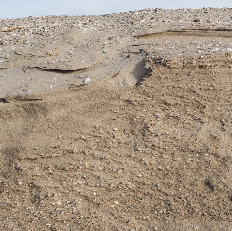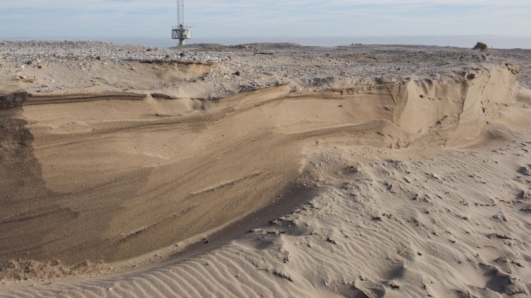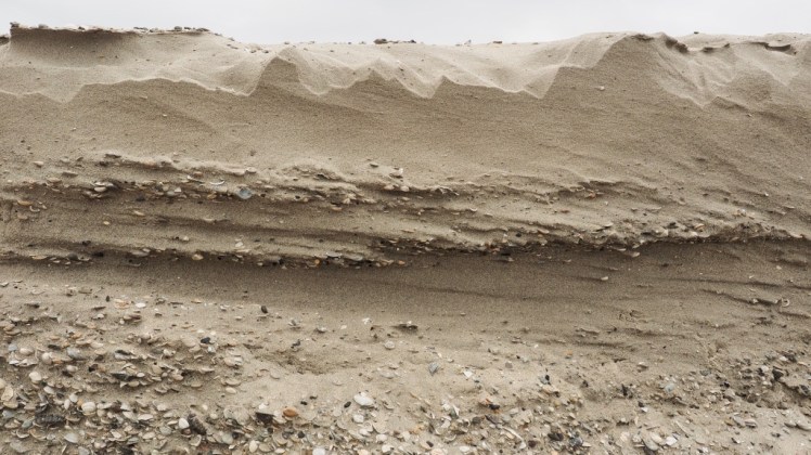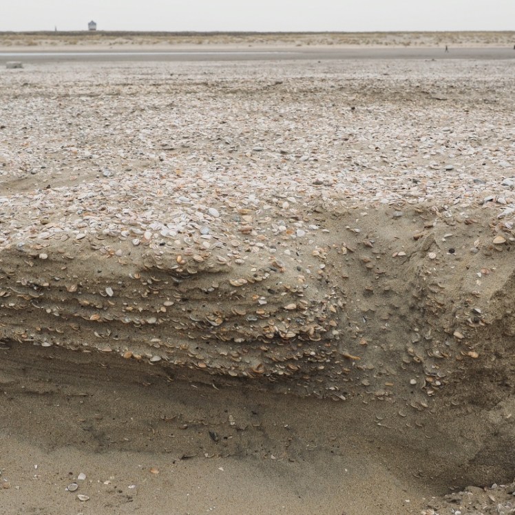 | Een enorme bult opgespoten Noordzeezand moet door water en wind onze stranden ophogen. Hoogwaters spoelen en vreten het zand weg en ondermijnen het tot menshoge kliffen. |