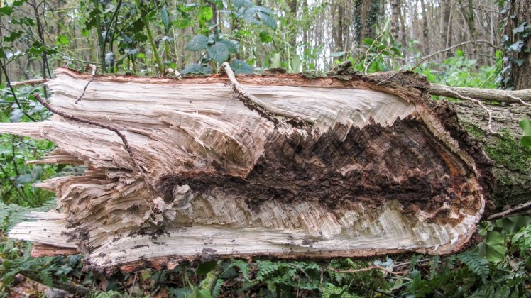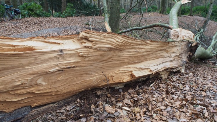 | Een flinke storm is genoeg om al ingescheurde en ingerotte takken een laatste zet te geven, dan scheurt ook het gezonde hout langs de lange vezels af. |