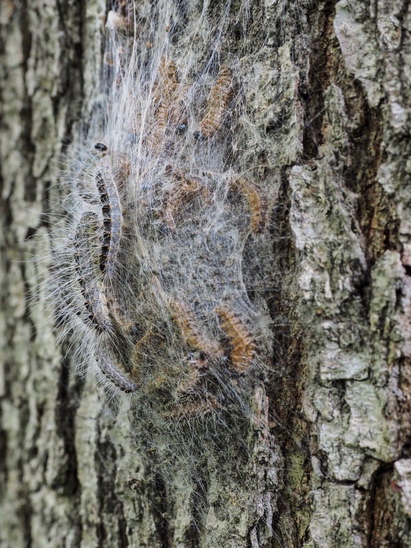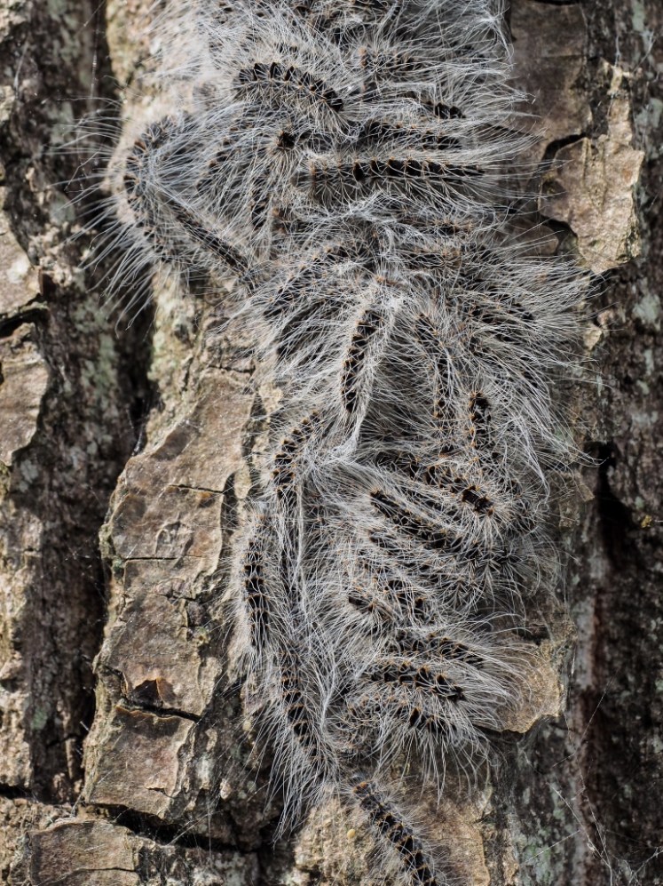 | Wat zijn ze mooi! En samen sterk! Vanuit hun veilige spinsel’nest’ in processie omhoog, op voedseltocht, in een ‘harnas’ van stevige witte haren en daartussen hun brandhaartjes. Jammer dat hun gezamenlijke bescherming de mensen irriteert .. |
