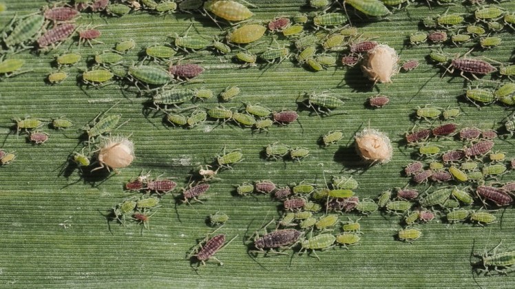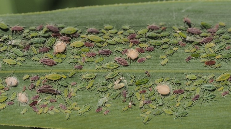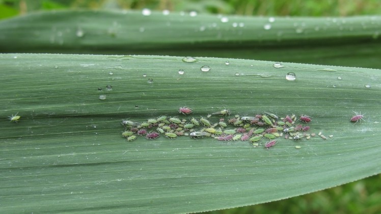 | De melige pruimenbladluizen leven ook goed op riet: niet mis om in zo’n stevig blad je ‘tanden’/zuigsnuit te moeten zetten, ook de jongste jongen, die aan de lopende band levend(!) geboren worden. |