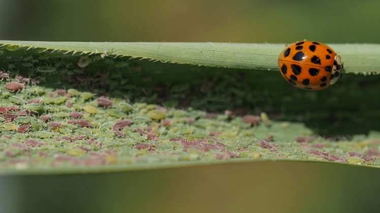| Zie je zulke papierachtige bolletjes tussen je bladluizen: wees blij! Door sluipwesplarven leeggegeten die nog veel meer bladluizen gaan parasiteren. Ook dit lieveheersbeestje herkent hier prima voer voor haar jongen. |