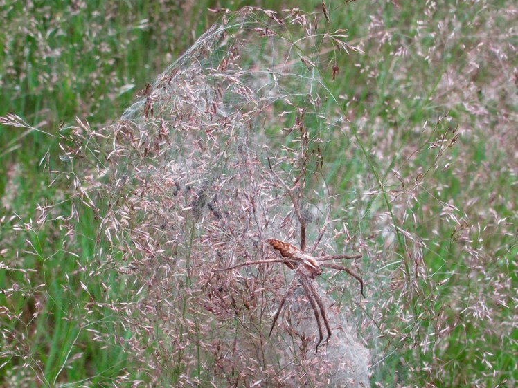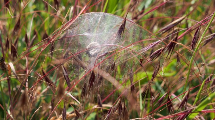 | Als haar eieren bijna uitkomen weeft de Kraamwebspin een kraamkamer van samengesponnen grassen, daarin hangt ze haar eicocon en houdt de wacht tot ze veilig zijn uitgekomen en vertrekklaar gegroeid. |