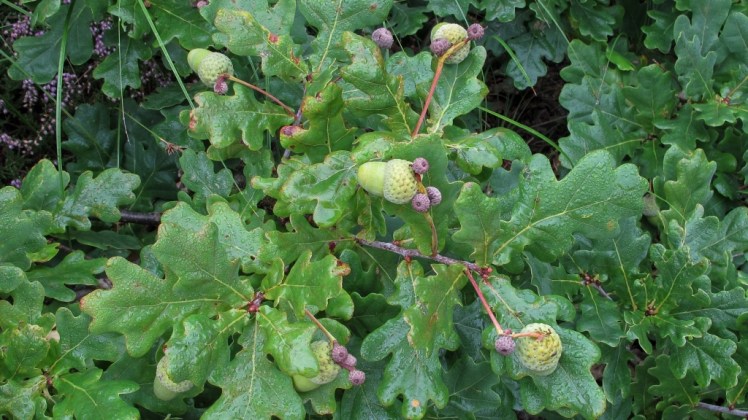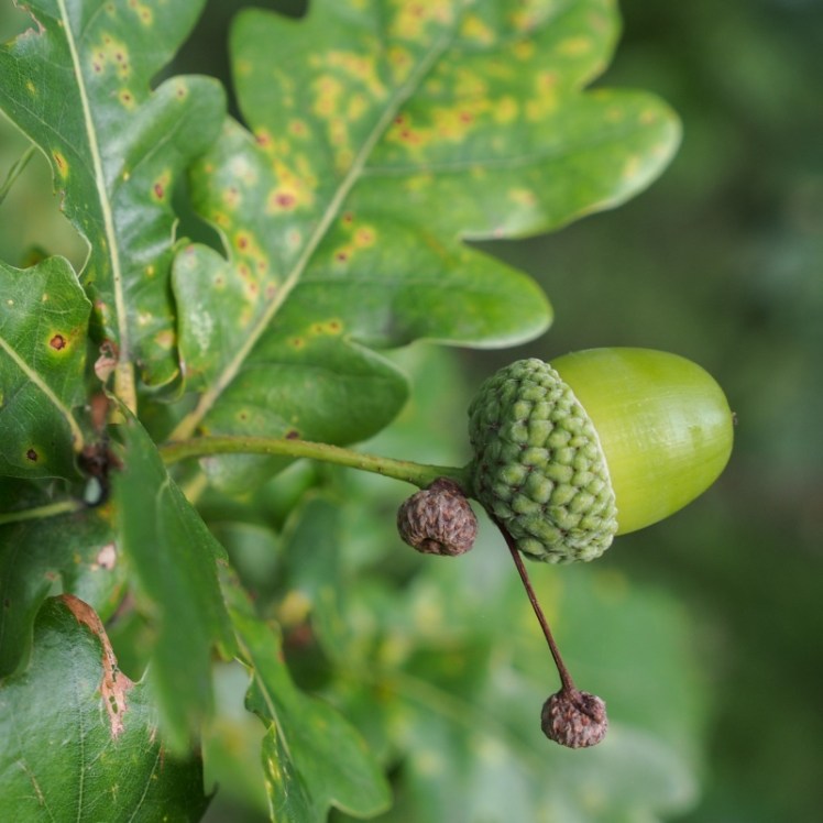 | De eikeltjes zijn uit hun dopjes gegroeid, ze rijpen en vallen. Maar die achterblijvers: niet goed bestoven? Of pikken de snellere ‘broertjes/zusjes’ eikel het voedsel van ‘moeder’ eik in? |
