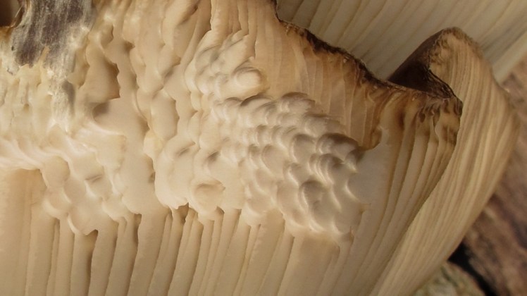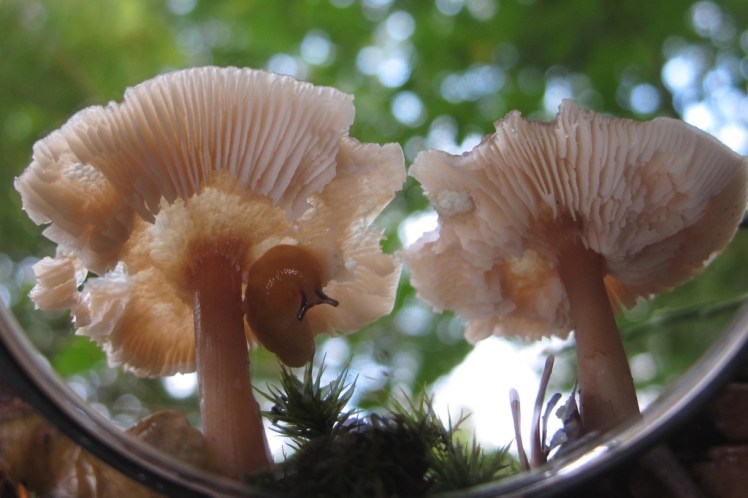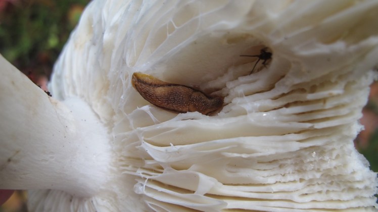 | Toptijd voor naaktslakken met al die verse paddestoelen: eiwitrijke maaltijden te over, met hun tong raspen ze er gemakkelijk kuiltjes uit. En zelfs overdekte eet- en schuilplekken (ook voor springstaartjes ..) |