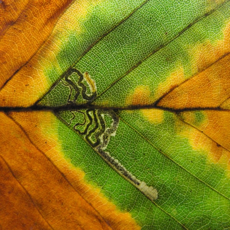 | Uit het ei geboren in het smalste begin eten de larven zich een weg door het bladmoes. Na elke vervelling wordt hun gang (en poepspoor) breder tot ze in de eindkamer verpoppen, en als minivlindertje (of -vliegje) uitvliegen. Hun bladdeel houden ze extra lang groen = productief/voedzaam |
