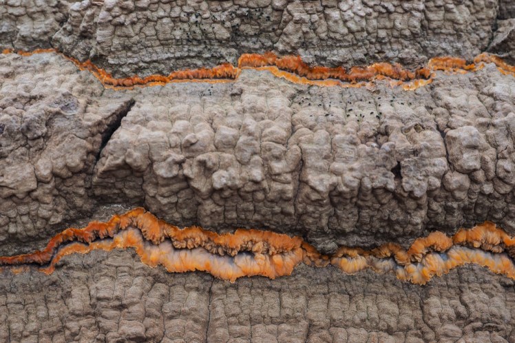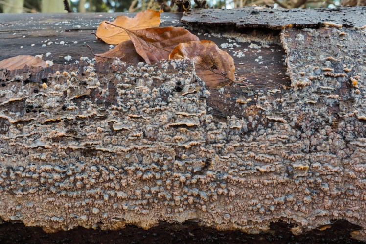 | Als die miezerige mistigheid het dode hout mooi vochtig houdt kan ook de oranje aderzwam aanschuiven aan de kringloop-dis: al ‘etend’/verterend groeit hij gestaag over alles wat op zijn pad komt. |