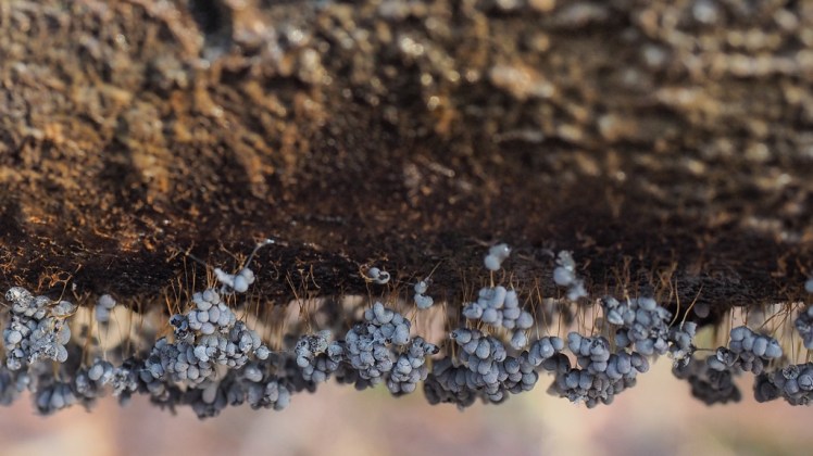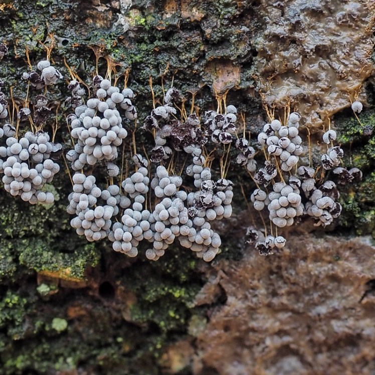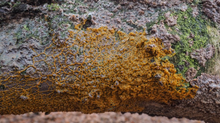 | Met zijn hele ‘lijf’ (plasmodium) vloeit hij traag door over het dode hout en over alles wat hij tegenkomt. Als hij genoeg gerijpt is verandert dat hele gele netwerk in honderden hangende mini-paddestoeltjes, propvol donkere stoffijne sporen. |