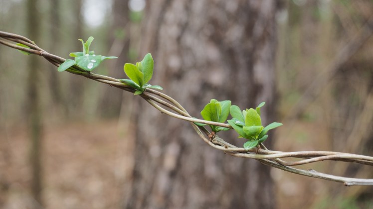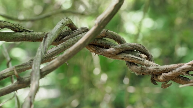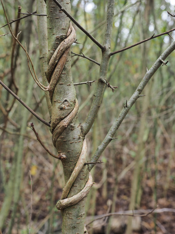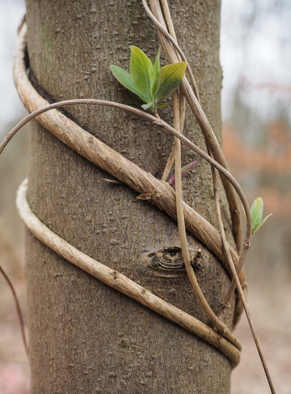 | Wie niet stevig is moet slim zijn: omhoog naar licht voor je nieuwe blaadjes door steun te zoeken langs grote jongens, in een losse omarming, of draai om jezelf heen, tot stevige kabels. Maar als je ‘ladder’ dikker groeit groeit hij zich klem … |
