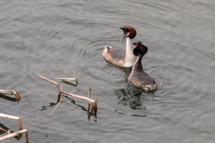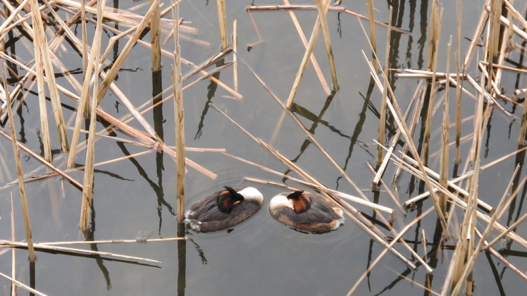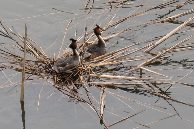 | Eerst samen kopschuddend dansen, dan balancerend over haar heen op het nog dunne slappe (drijvende ..) nest, hun bruidssuite. Na nog wat hartelijk kopschudden samen slapen, tot de volgende acties: meer paringen, nest verstevigen, eieren leggen, broeden. |