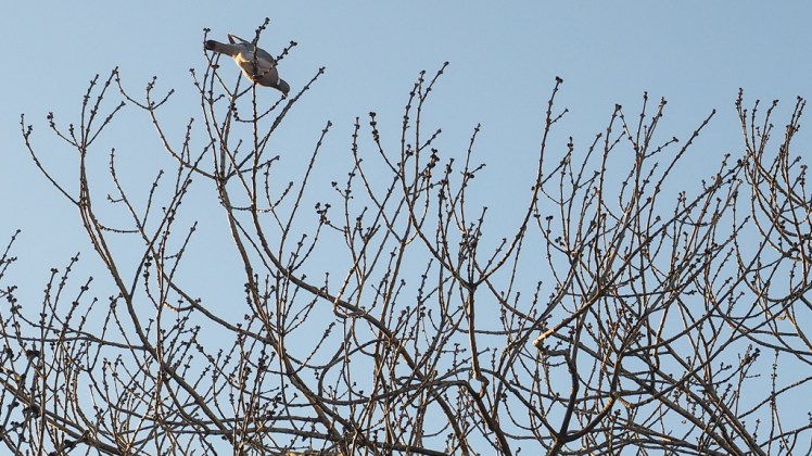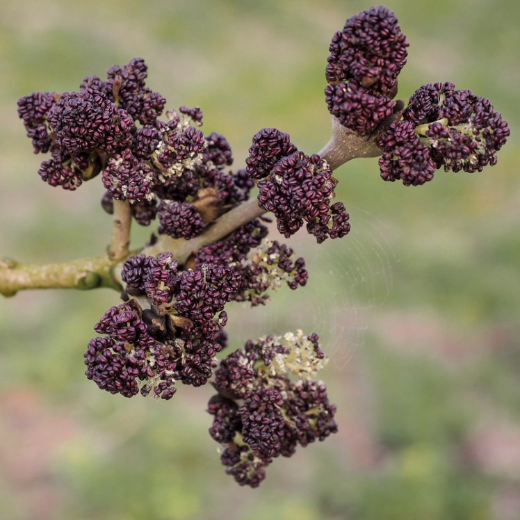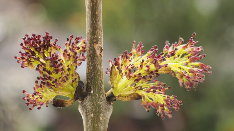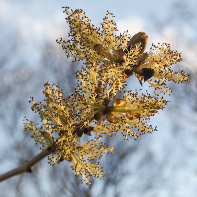 | Aan de nog winters kale takken duwen de ‘bloemen’ zich uit hun knoppen om onopvallend (zonder bloemblaadjes) maar uitbundig te bloeien. Zoveel stuifmeel uit de meeldraadbloemen (mannetjes, hierboven) met de wind mee, naar al die stamperbloemen (vrouwtjes, onder). En voor houtduiven en andere beestjes: vers voedzaam voorjaarsvoer! |