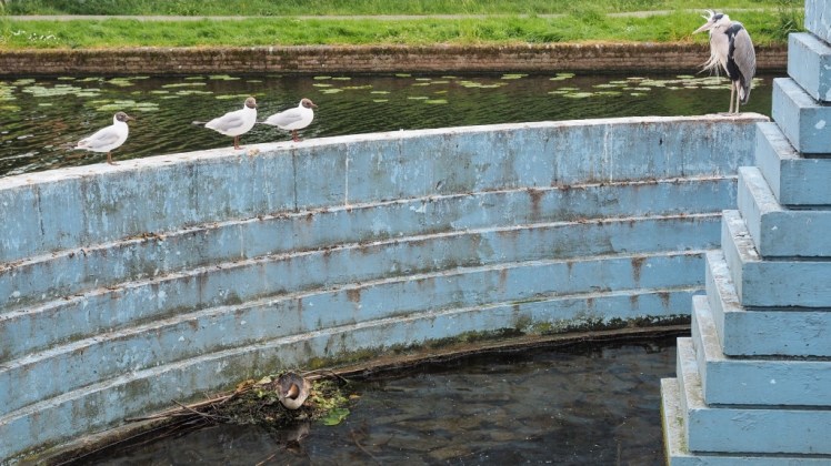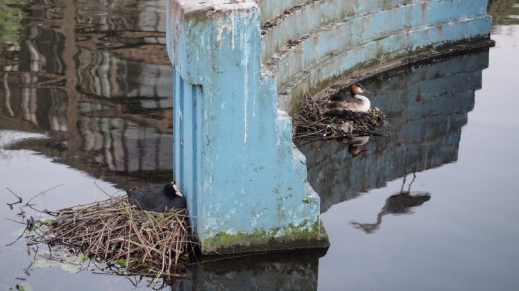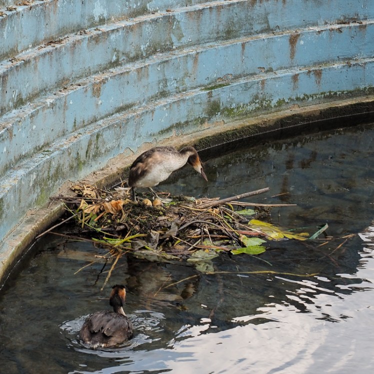 | Op zo’n gevaarlijke plek broeden!! Is hier de woningnood zo groot? Geen ei nog uitgebroed, maar ze gaan door: nest uitbouwen, nieuwe leg. |