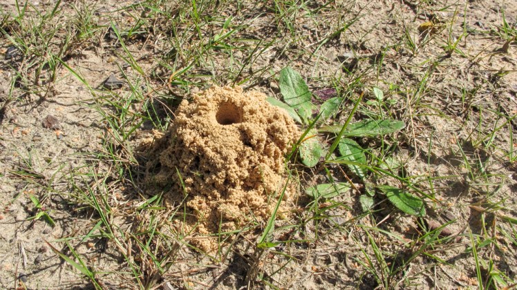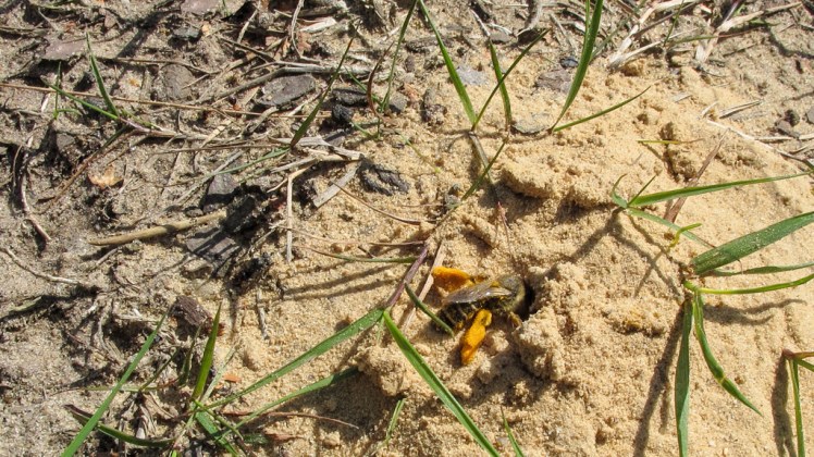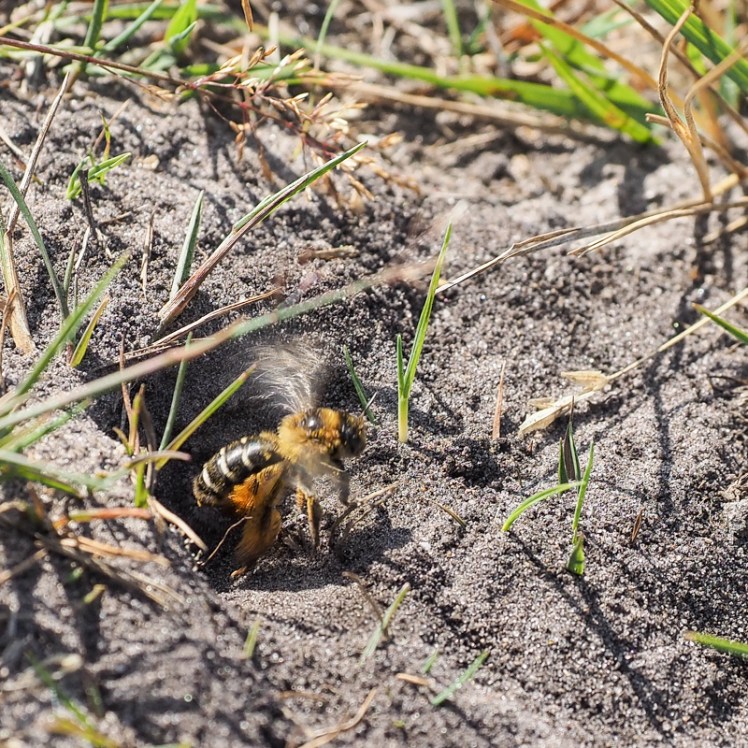 | Anders-/versgekleurde zandhoopjes langs bijv. een zandpad: hier graven pluimvoetbijen hun gang met broedkamers uit. Dat vraagt goed keuren: het zand los genoeg om te kunnen graven en stevig genoeg om niet in te storten (trap er dus niet op …..) |