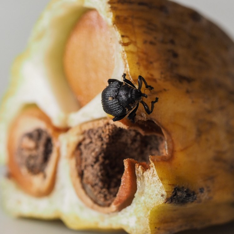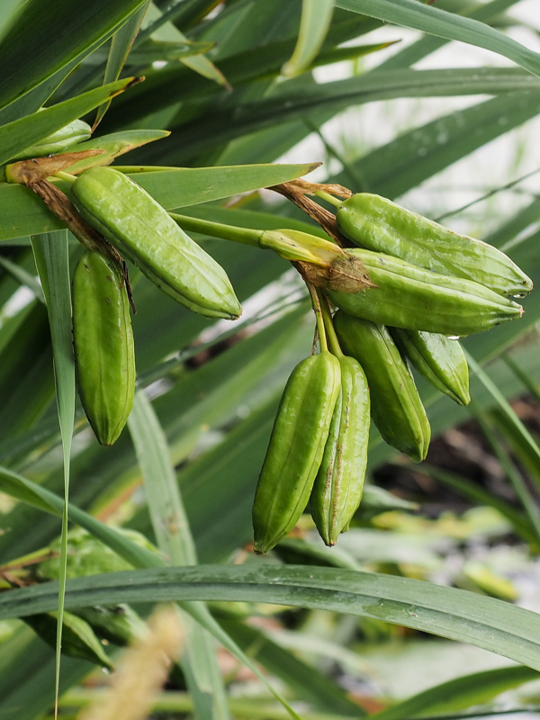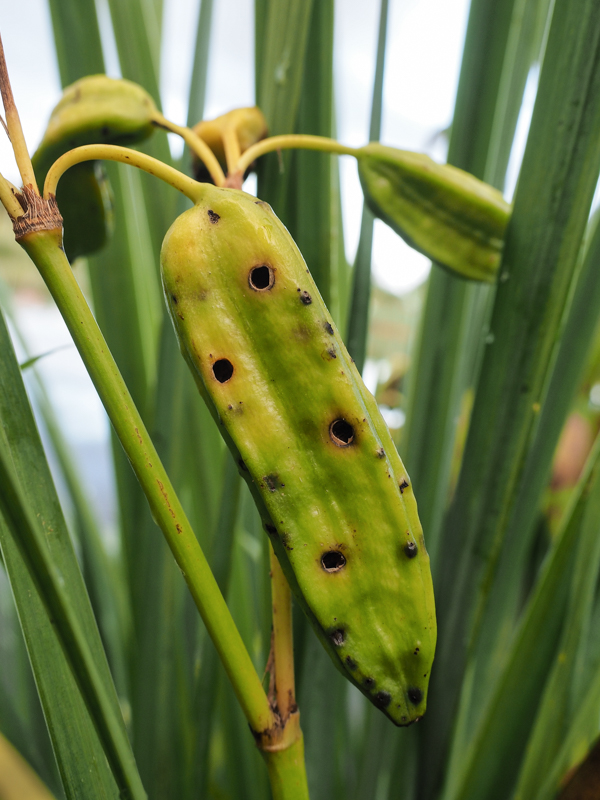 | Na de bloei hangen de gele lissen hun vruchten te rijpen. In de jonge zaden eten de larven van de lisboorder zich groot en boren zich naar buiten als volwassen snuitkevertje. |