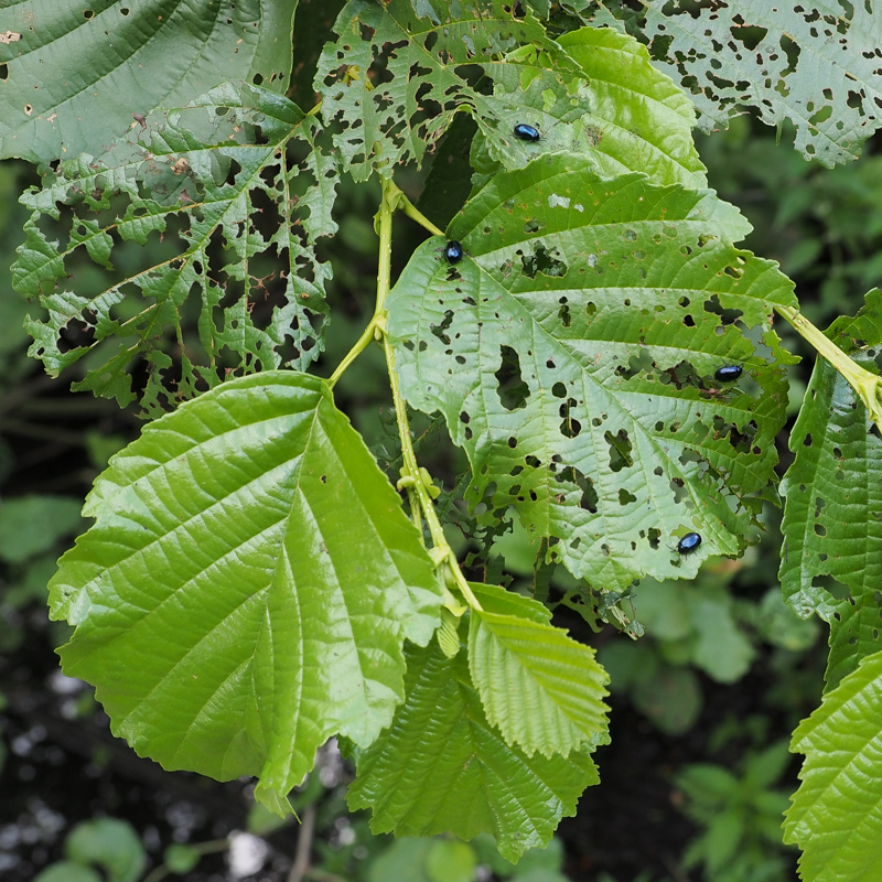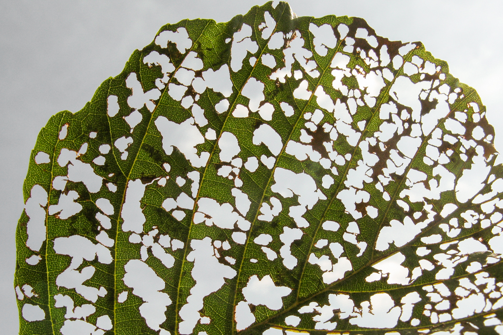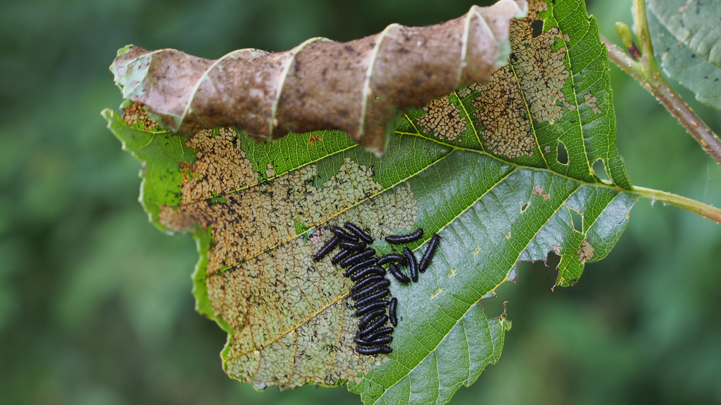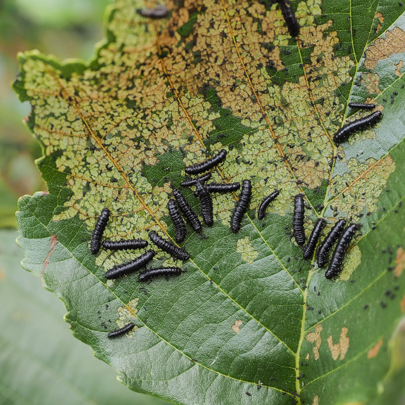 in juni schraapten hun larven in colonne het bladmoes van de bladeren,