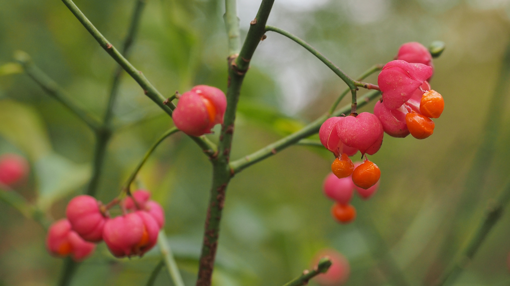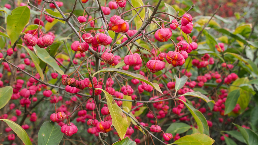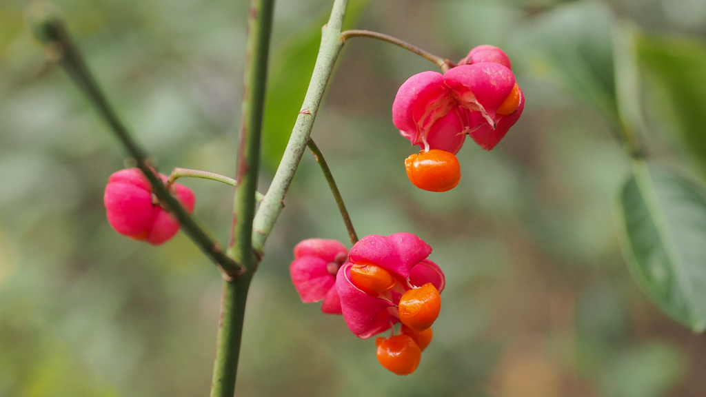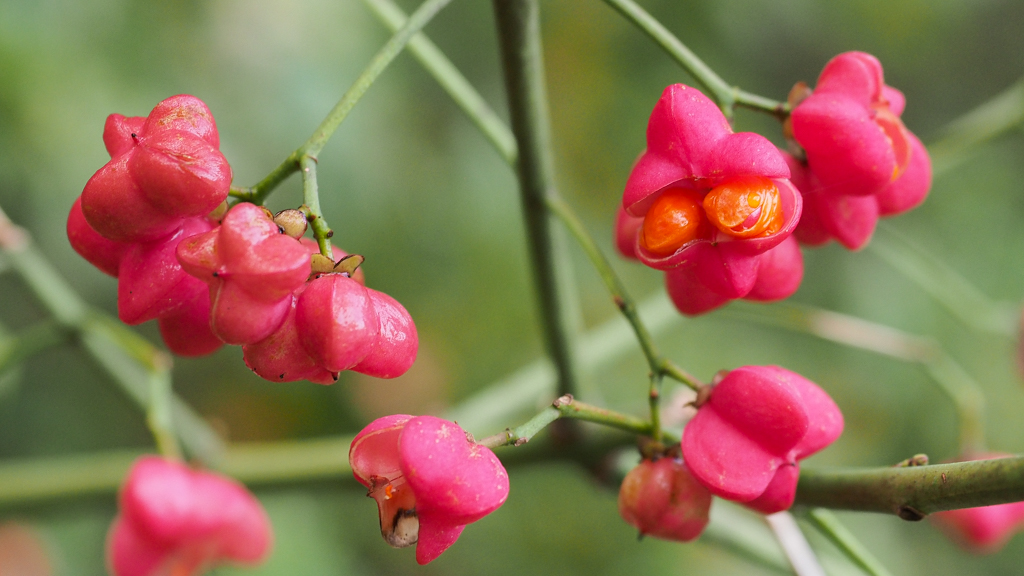 De kardinaals”mutsjes” openen om hun rijpe bessen buiten te hangen,