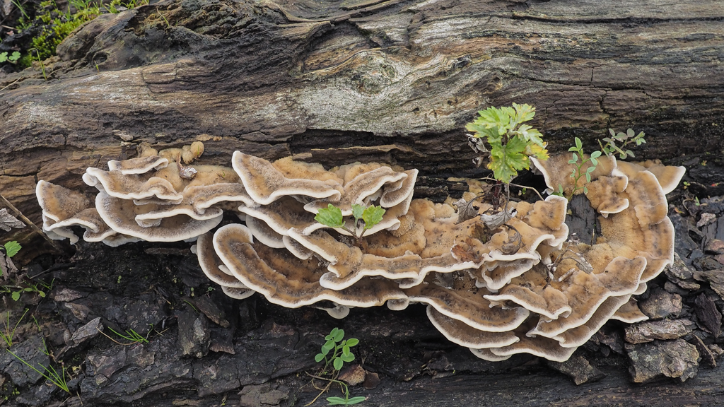 Als hun mycelium/zwamvlok in het dode hout genoeg heeft ‘gegeten’/verteerd