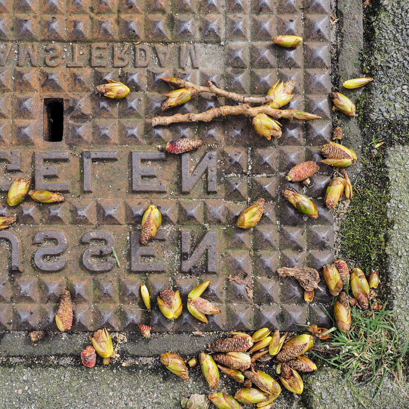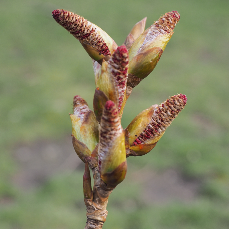 Katjes groeien uit hun knoppen, de (rode) meeldraden al zichtbaar: