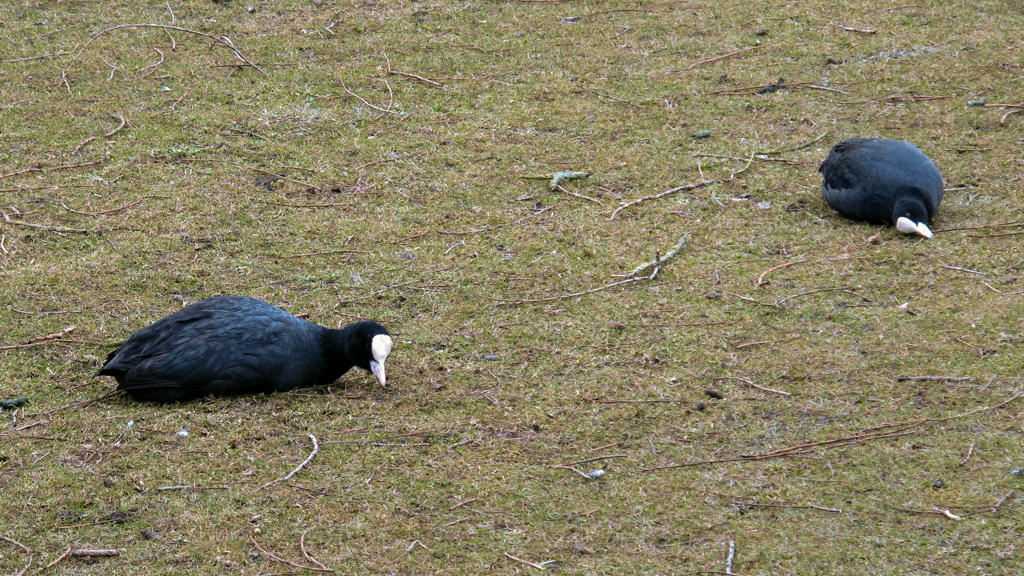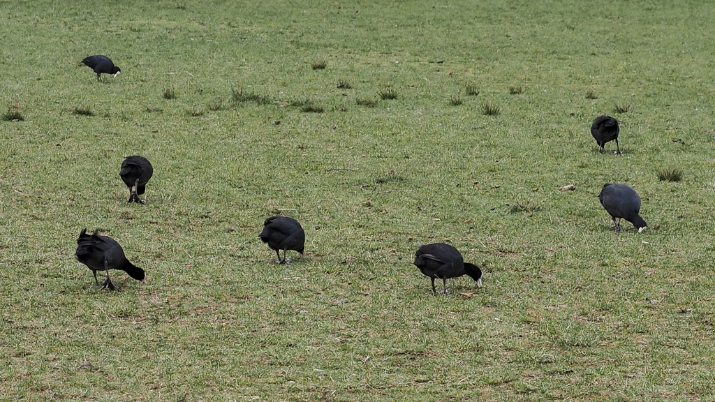 Meerkoeten grazen gras zolang hun sappiger waterplanten nog uitblijven: