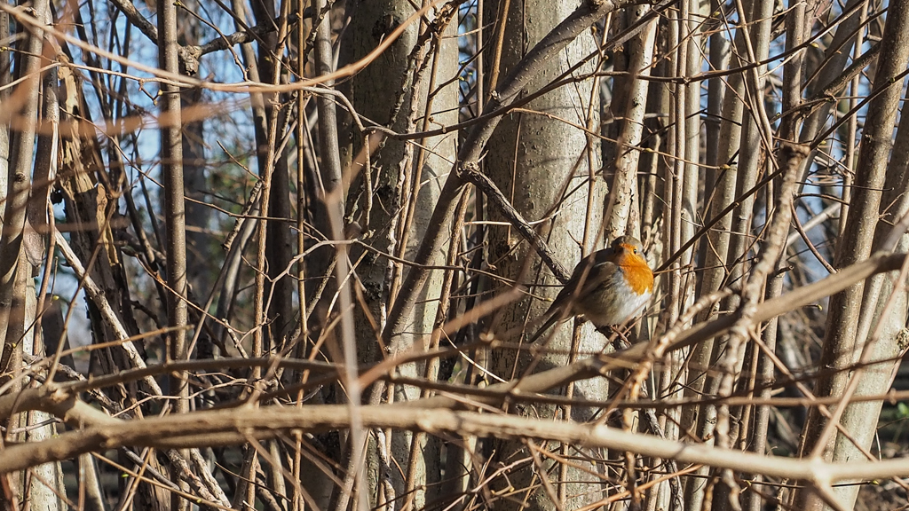 Met bolle veertjes kleumt een roodborstje tussen de kale takken,