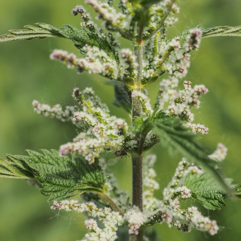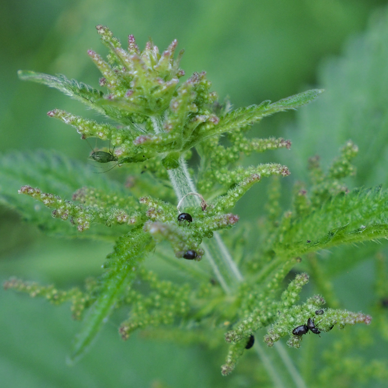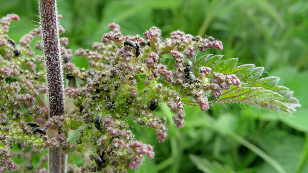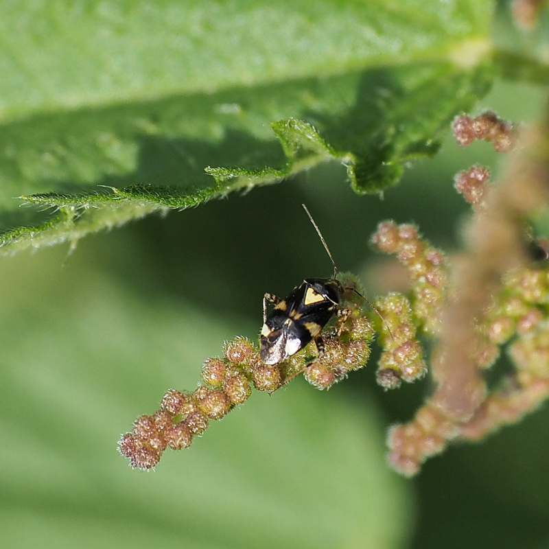 De brandnetelprachtwants (rechts) zuigt sappen, liefst uit brandnetels.