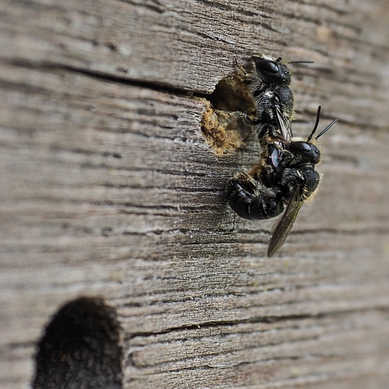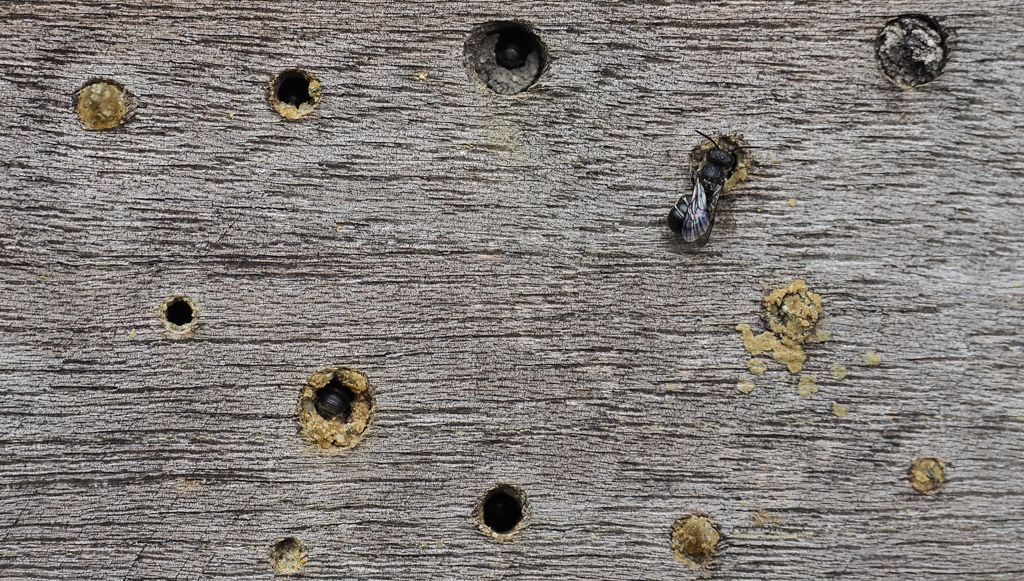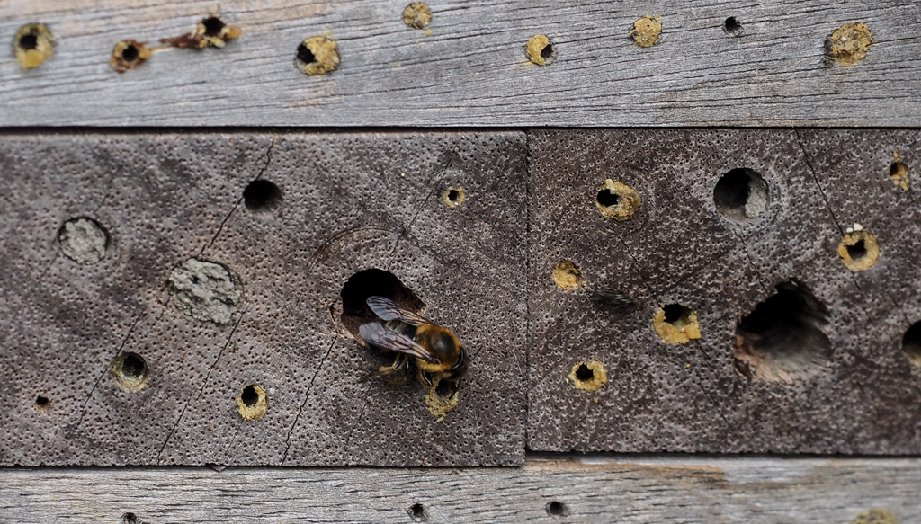 Rosse metselbijen (boven) in de grotere, dichtgemetseld met wat modder,