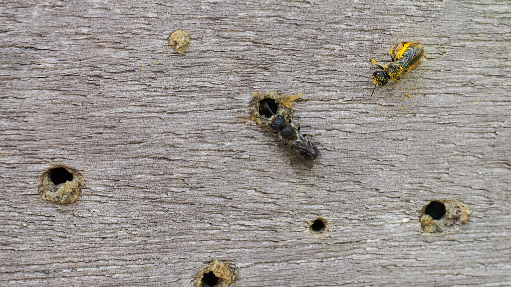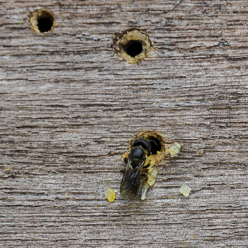 tronkenbijtjes (onder) sluiten hun gangetjes af met boomhars en wat zand.