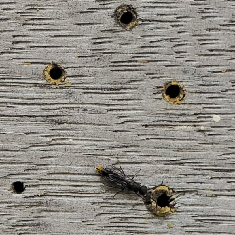 Nee, deze knotswespjes zijn niet de eigenaren van deze nestgangen.