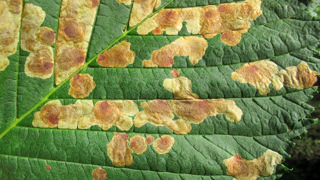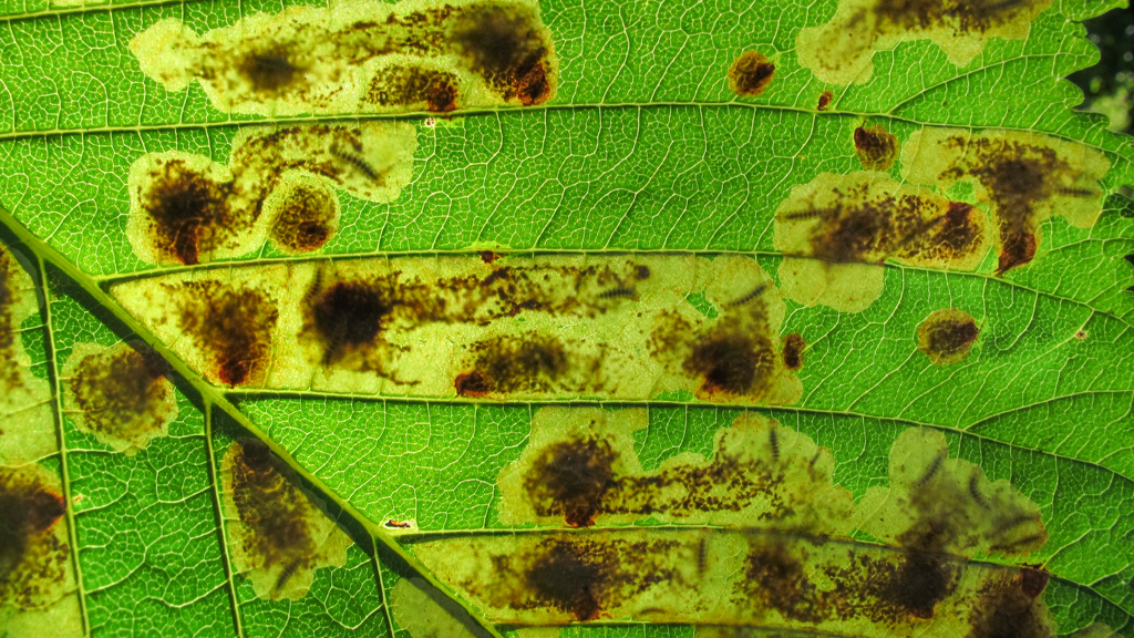 de mineerlarven hun ‘mijn’/holte steeds verder in het bladmoes uitgraven/-eten: