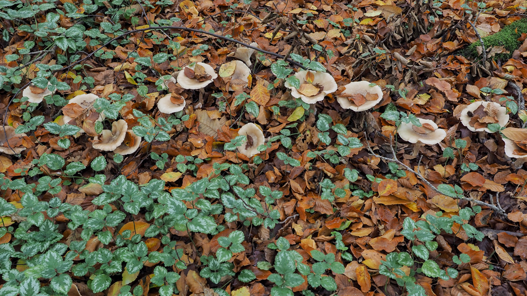 in hun wijde heksenkringen, die in recht lijkende lijnen door het bos lopen.