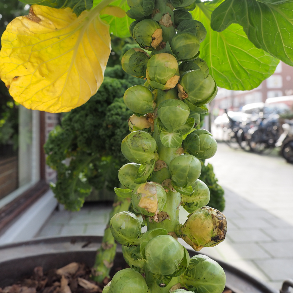 Aan de rechter kool nog losse spruiten waar slakken al van gesnackt hebben