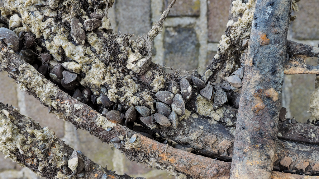 Aan zo’n wrak wilden ook driehoeksmosselen zich graag vastplakken.